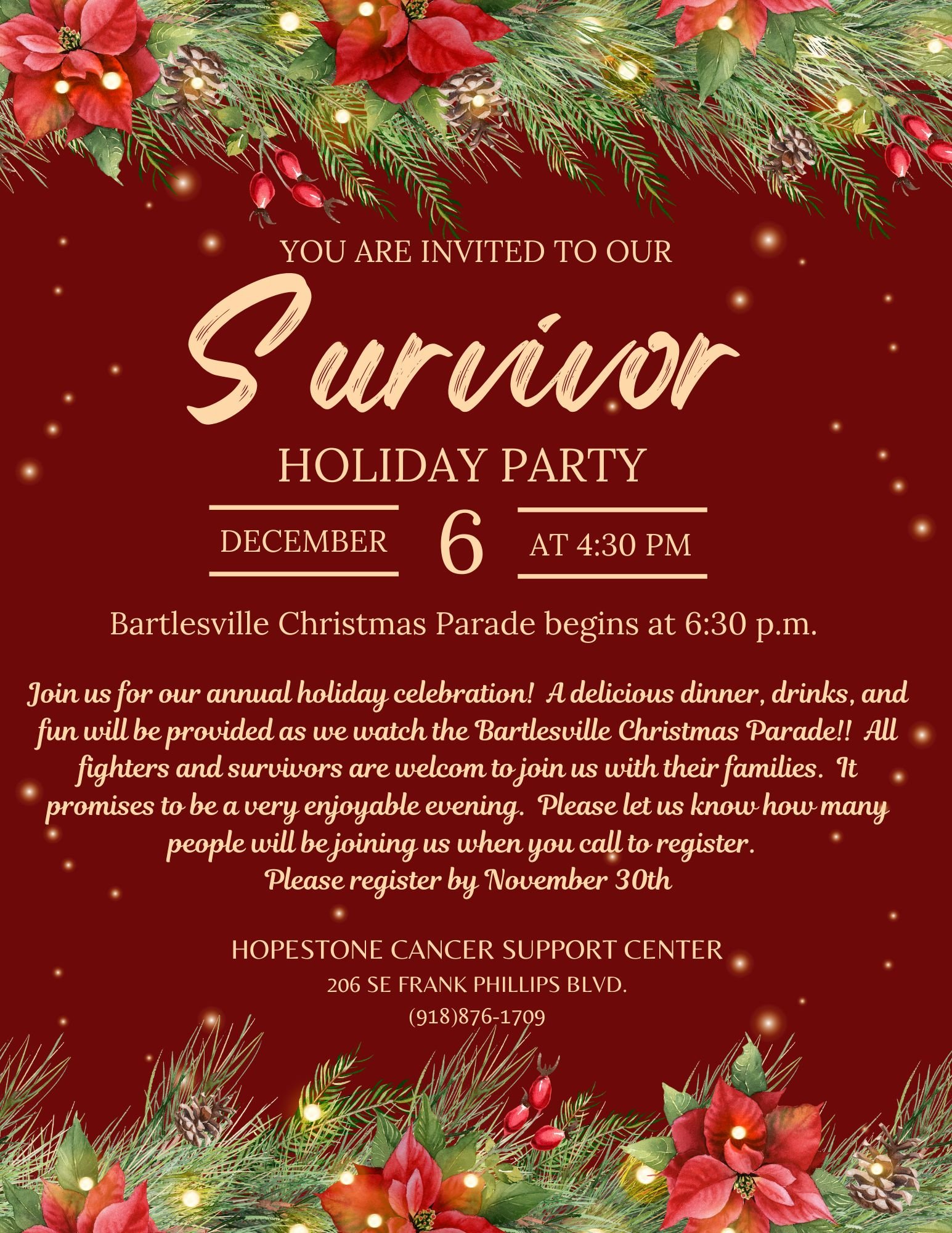 Survivor Holiday Party * Survivor Holiday Party * Survivor Holiday Party * Don’t forget to call and reserve your spot for this year’s Survivor Holiday Party. We are looking forward to seeing everyone and celebrating another year of life!